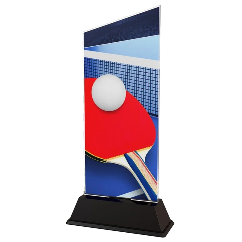 Trofej akrylátová s motívom stolný tenis Veľkosti: 3 Materiál: akryl Možnosti: štítok / gravírovanie laserom , farebná potlač